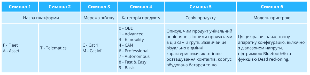 Наприклад: FTC921 → F = Автопарк, T = Телематика, C = мережа 4G LTE Cat 1
