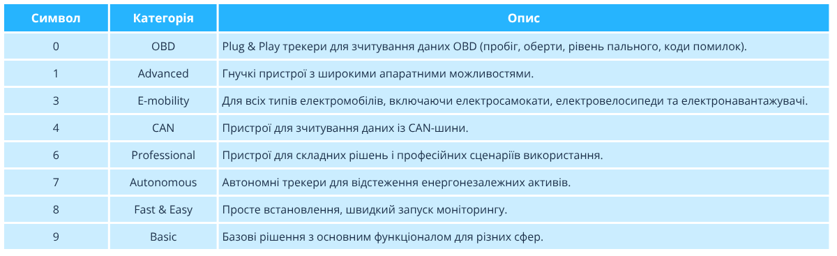 Комбінація цих символів об’єднує трекери зі схожими функціями і визначає серію пристроїв.
