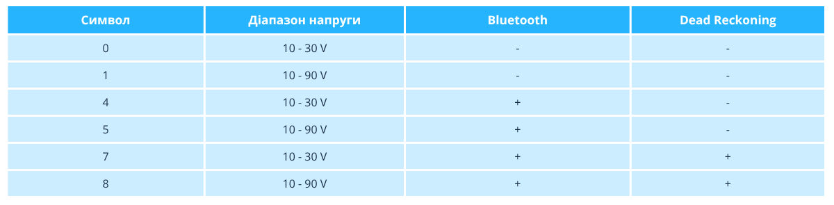 Наприклад, у FTC921 цифра 1 означає, що пристрій підтримує живлення 10–90 V, але не має Bluetooth® та Dead Reckoning.